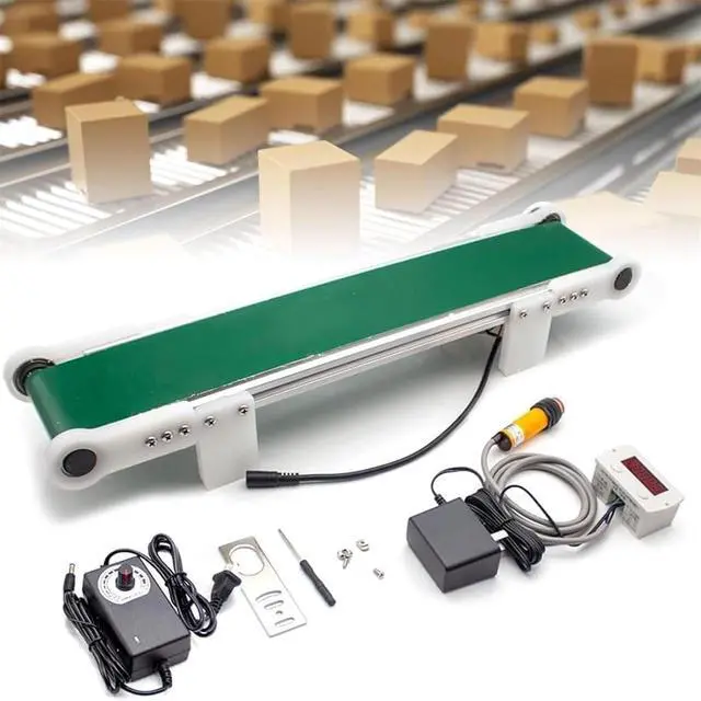 The Electric Desktop Conveyor Belt, a versatile and efficient tool for your workspace. This conveyor belt is perfect for moving small items or materials smoothly and efficiently. It features a motor with a DC 12V voltage, allowing for adjustable speeds ranging from 0 to 116 RPM.Specification:Name: Mini Metal Desktop ConveyorInput voltage: 100-240V; Output voltage: 12VBracket material: PVC materialConveyor belt effective length: about 49/69/99cmTotal size: length and width about 50/70/100*10cmConveyor belt width: 8cmHeight: 73mmMotor speed: 0- 116 RPMMaximum speed: 7.6cm/sSlowest speed: 1.8cm/sPackage Included:1 x Desktop Conveyor1 x Adjustable Power AdapterNote: - If you have any questions, please write to us and we will be happy to help you.