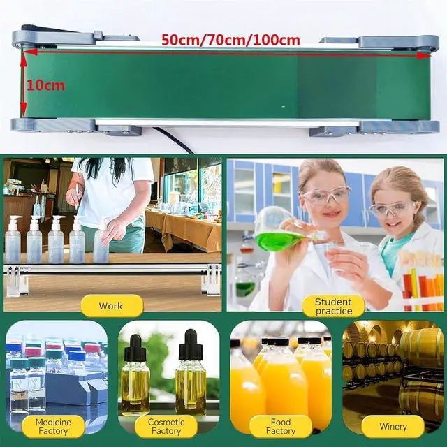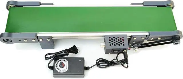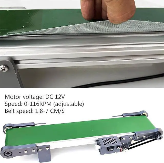 The Electric Desktop Conveyor Belt, a versatile and efficient tool for your workspace. This conveyor belt is perfect for moving small items or materials smoothly and efficiently. It features a motor with a DC 12V voltage, allowing for adjustable speeds ranging from 0 to 116 RPM.Specification:Name: Mini Metal Desktop ConveyorInput voltage: 100-240V; Output voltage: 12VTotal size: length and width about 50/70/100*10cmConveyor belt width: 8cmHeight: 73mmMotor speed: 0- 116 RPMMaximum speed: 7.6cm/sSlowest speed: 1.8cm/sPackage Included:1 x Desktop Conveyor1 x Adjustable Power AdapterNote: - If you have any questions, please write to us and we will be happy to help you.