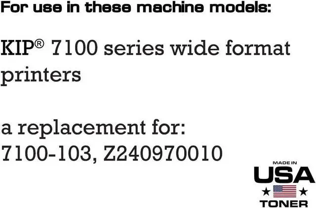 Compatible Toner for KIP 7100 (Z240970010) Toner kit: 2 - 300 gm. cartridges Same quality as OEM, at a better price Made In USA Excellent Line Resolution, Solid Black Density