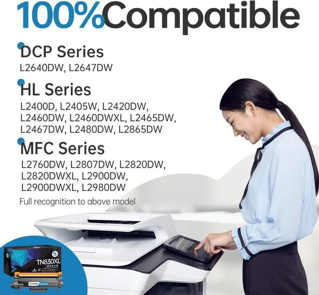 TN830XL Compatible Printers: Brother DCP-L2640DW, HL-L2460DW, HL-L2465DW, DCP-L2647DW, HL-L2400D, HL-L2405W, HL-L2420DW, HL-L2460DWXL, HL-L2467DW, HL-L2480DW, HL-L2865DW, MFC-L2760DW, MFC-L2807DW, MFC-L2820DW, MFC-L2820DWXL, MFC-L2900DW, MFC-L2900DWXL, MFC-L2980DW