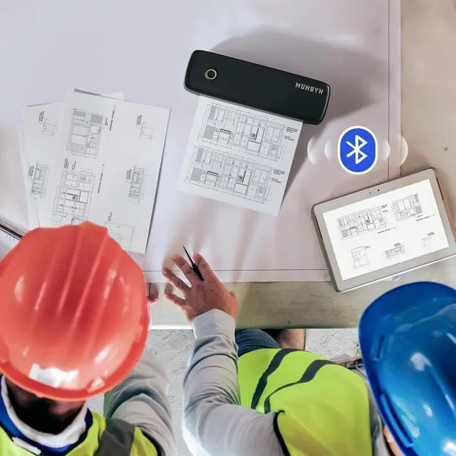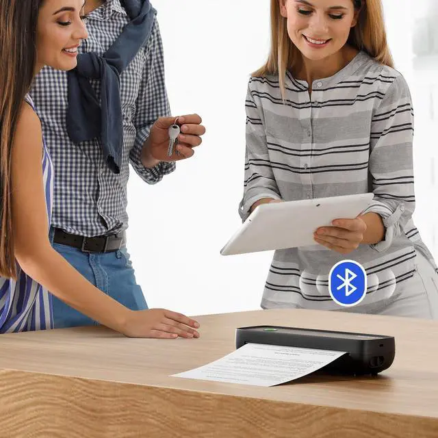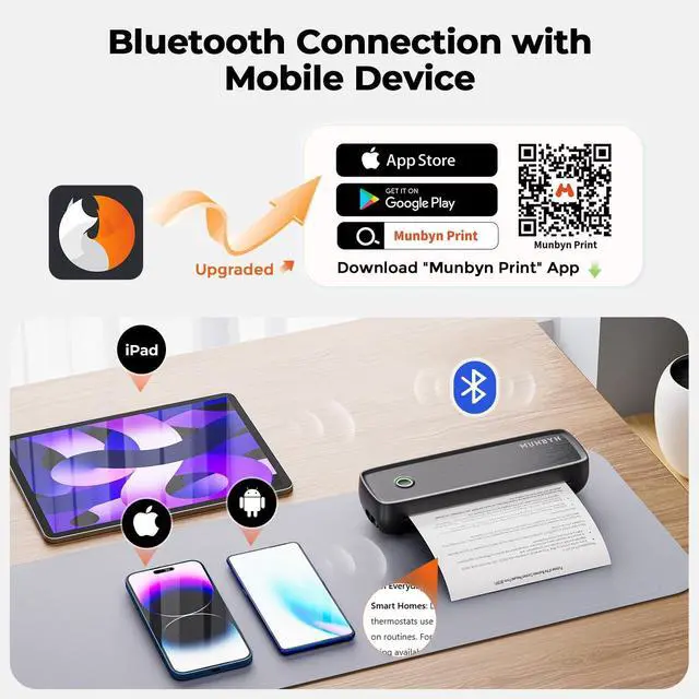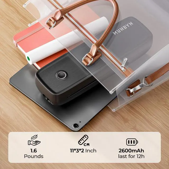 [Portable and Compact] MUNBYN ITP04 A4 thermal printer weighs only 750g, which is comparable to a water bottle, and is 28.2cm long, which is comparable to a pad. Travellers will find this portable wireless printer ideal as it enables on-the-go printing with Bluetooth connectivity. In addition, the built-in 2600mAh battery ensures continuous operation all day. This compact printer is everything you need to print documents with ease, whether you're in a classroom, library, airport or even the Grand Canyon