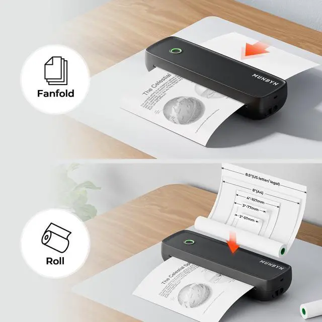 [More Printing Options] MUNBYN A4 portable printer has a built-in stop to adjust the width of the paper slot, which can be flexibly modified to print on MUNBYN thermal paper of US letter/A4 width, and also supports rolls and folded paper. Meet your printing needs for many occasions