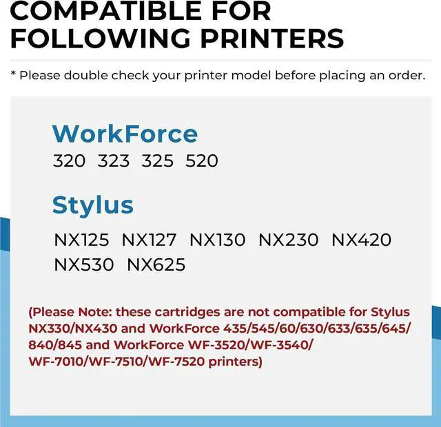 Compatible with Select Printers: Stylus NX125 NX127 NX130 NX230 NX420 NX530 NX625 WorkForce 320 323 325 520Please Note: these cartridges are not compatible for Stylus NX330/NX430 and WorkForce 435/545/60/630/633/635/645/840/845 and WorkForce WF-3520/WF-3540/WF-7010/WF-7510/WF-7520 printers