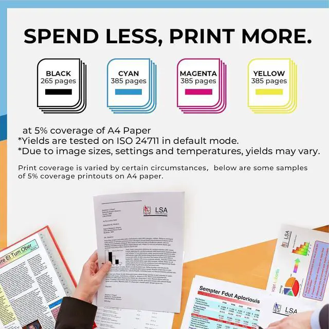 High page yield: Up to 265 pages per Black cartridge,385 pages per color cartridges (Cyan,Magenta,Yellow),(based on 5% coverage) (Yields are tested on ISO 24711 in default mode) (image size,printer settings and temperature may affect page yields.)
