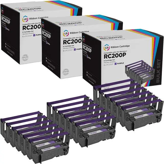 Save even more with our compatible ribbon cartridges. This set includes 18 RC200P purple ribbon cartridges. Why pay more for brand name Star Micronics RC200P cartridge? This item works in the following Star Micronics and Casion printers: MP100, MP200, MP212, MP216, MP221, MP231, MP232, MP235, MP236, MP242, MP246, MP292, MP512, SCP700, SP200, SP2000, SP212FC, SP212FD, SP216-2COLOR, SP2320, SP246-2COLOR, SP242, SP246-2COLOR, SP2520, SP2560-2COLOR, SP298, SP500, SP512MC, SP512MD, SP542, SP800, and Casio SP-1300. We are the exclusive reseller of LD Products brand of high quality printing supplies.