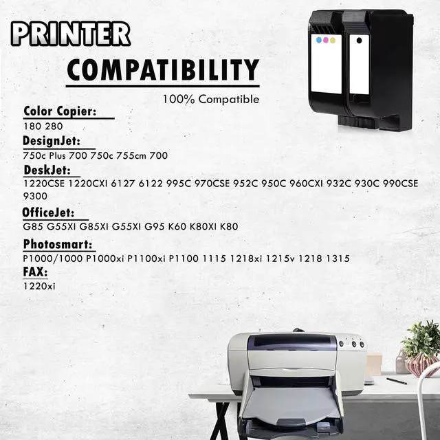 For use in HP Printer Models: Designjet 750c Plus 700 750c 755cm 700, COLOR COPIER 180 280, DESKJET 1220CSE 1220CXI 6127 6122 995C 970CSE 952C 950C 960CXI 932C 930C 990CSE 9300, FAX 1220xi, OfficeJet G85 G55XI G85XI G55XI G95 K60 K80XI K80, Photosmart P1000/1000 P1000xi P1100xi P1100 1115 1218xi 1215v 1218 1315