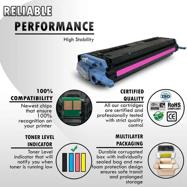 These Inkfirst Remanufactured toner cartridges replacement for HP Q6003A 124A are manufactured in ISO9001 certified factories.