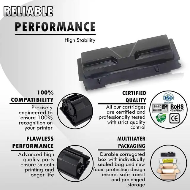 These compatible TK-132 TK132 toner cartridges are manufactured in ISO9001 certified factories. This ensures that our compatible toner cartridges for Kyocera TK-132 TK132 will provide the same premium printing quality as the OEM products.