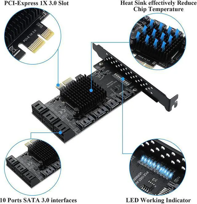 10 Ports PCI-E to SATA 3.0This PCIE SATA CARD allows you to add 10 SATA 3.0 6Gbps devices to your computer. No need to drive, plug and play.
