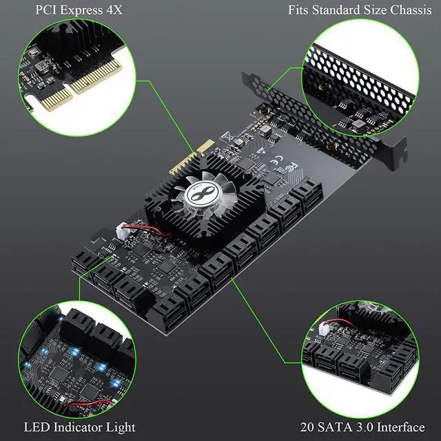 Built-in 6*ASM1064+ASM1812 chips, which improve the stability and compatibility of this SATA controller card. With heat sink and cooling fan can reduce the temperature quickly and maintain the stability of network transmission.