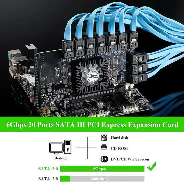 This PCIe SATA card provides 20 SATA 3.0 ports and 20 SATA cables, supporting simultaneous connection of 20SATA hard disk drives, with transfer speed up to 6Gbps.