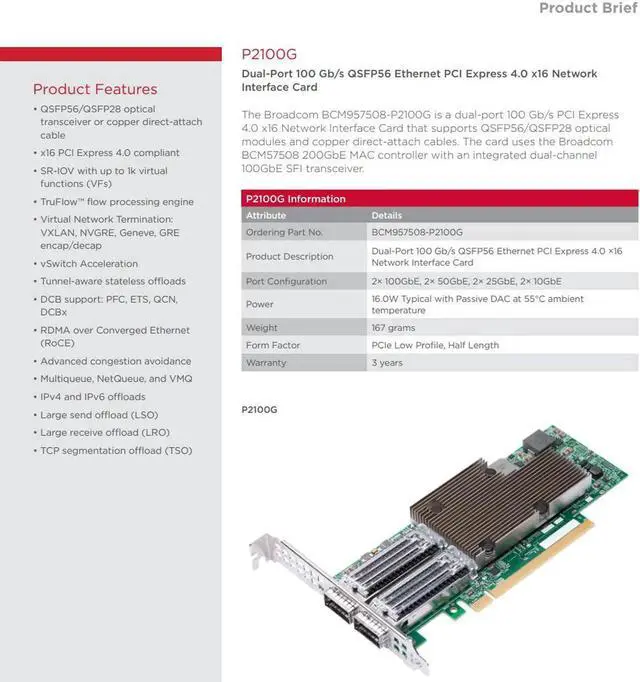 The P2100G 2x100G PCIe NIC builds upon the success of the widely deployed architecture by combining a high-bandwidth Ethernet controller with a unique set of highly optimized hardware acceleration engines to enhance network performance and improve server efficiency.
