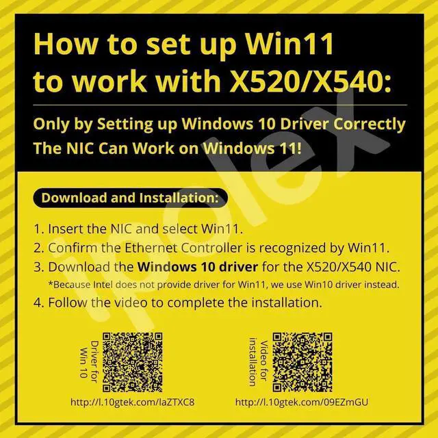: 1) You should install the Windows 10 driver and follow the direction of "how to set upWindows 11" to set up. 2) The Dell and HPE servers require MCU info matching the host OS; however, this NIC doesn't satisfy. Please contact us before making a purchase.