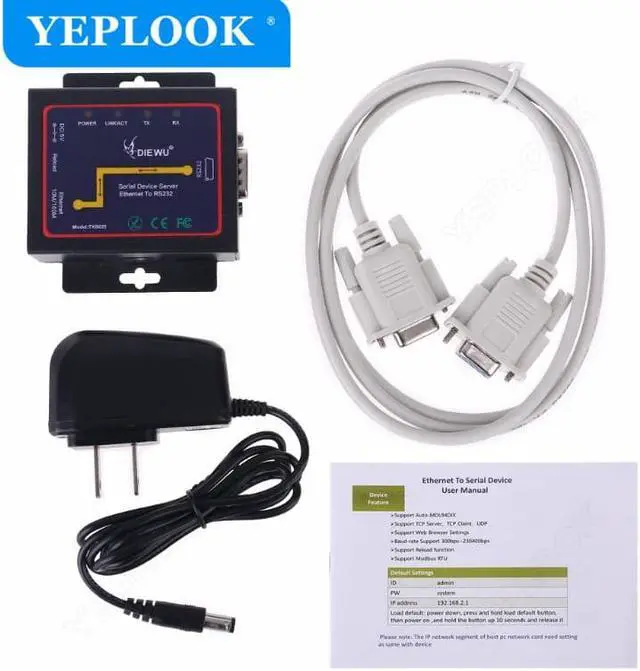 Package List: 1x Ethernet RJ45 to RS232 Converter, 1x Serial Cable, 1x Power adapter (The plug will meets your country standard)