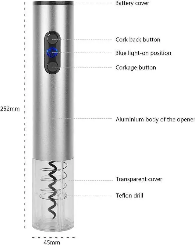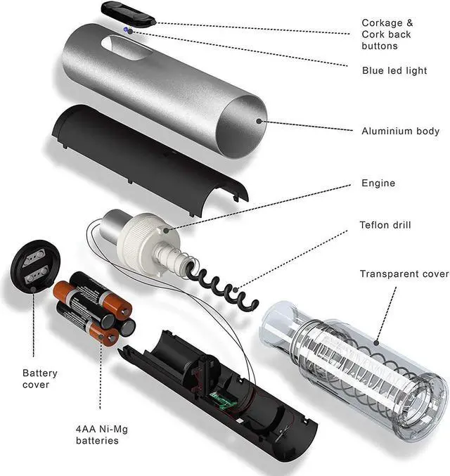 1. Combination: battery electric bottle opener, VS05 vacuum stopper, WP01 wine pourer, paper cutter 2. Rated voltage 3.6V 3. Rated power 5W 4. Noise <75 dB
