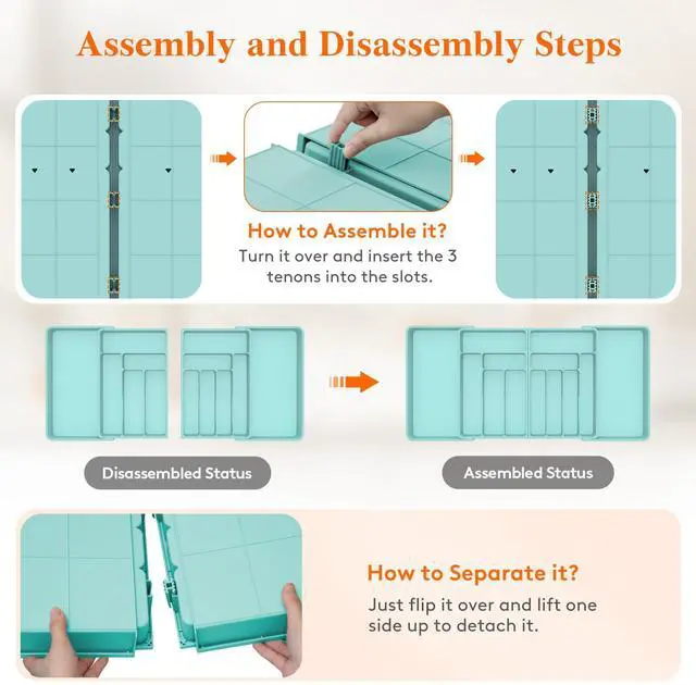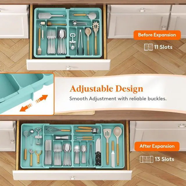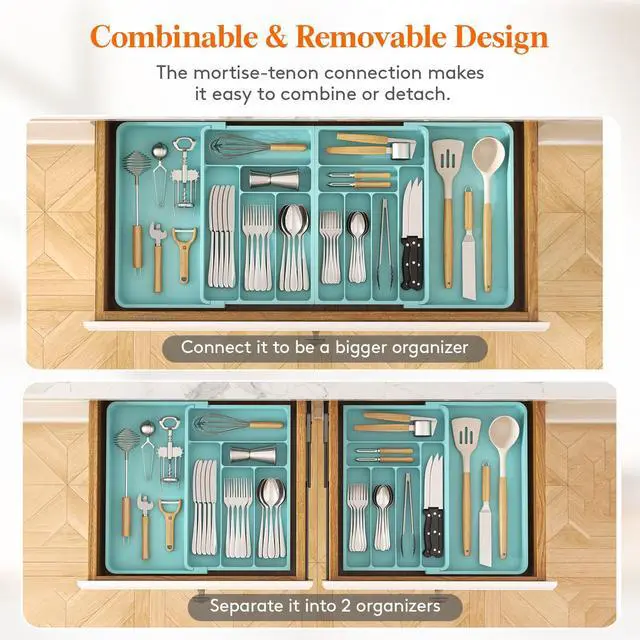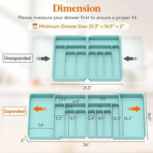 Before purchasing, please measure your drawer for the perfect fit. Our organizer measures 36" × 16.9" × 2" when fully expanded and 21.3" × 16.9" × 2" when fully folded, accommodating various drawer sizes. It can also be separated into 2 individual organizers for smaller drawers.