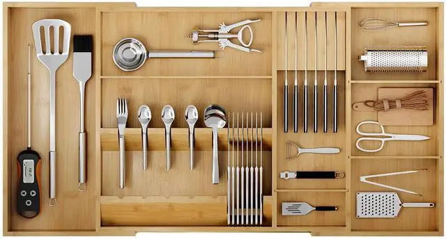 Features 3 removable dividers to create 8 slim slots (egg separators, spoons), 5 roomy compartments (whisks, spatulas)