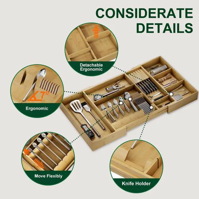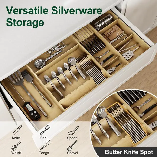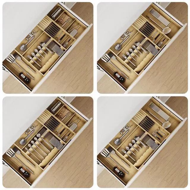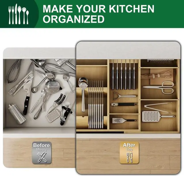 Crafted from sturdy, bamboo, this utensil drawer organizer adapts to your needs—slide dividers, remove panels, or adjust layouts to fit anything from spoons to spatulas. Lightweight yet tough, it transforms cluttered drawers into neatly customized spaces, fitting most sizes while maximizing every inch. Smart storage meets innovation, effortlessly.