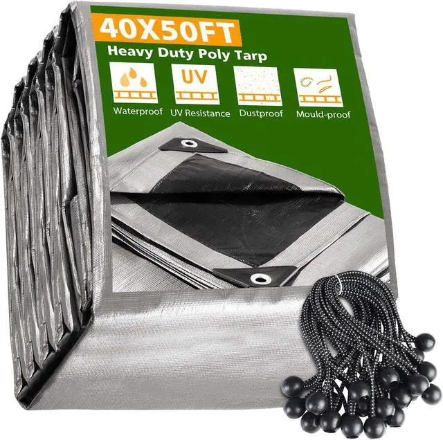 - Strong & Durable Shelter - 40x50ft Silver and Black Poly Tarp forms a strong and durable shelter from sunlight, rain and dust, cooler underneath in the summer; with at least 3 years lifetime, it features good ability of anti-aging for long-time use