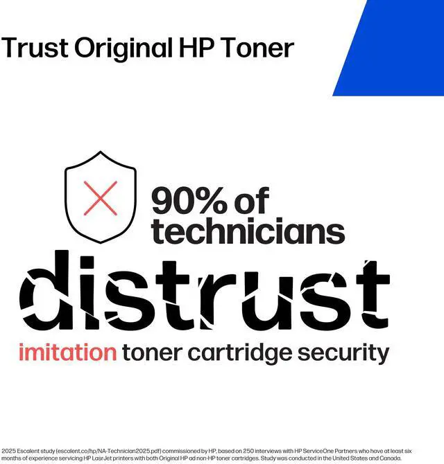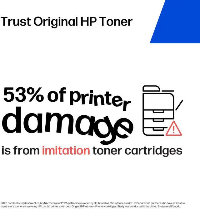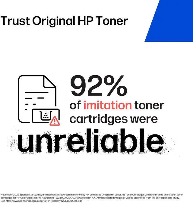 http: //hp. com/hprecycle. HP combines cartridges returned through HP Planet Partners with other plastics to make new Original HP Print Cartridges and other everyday products. See hp. com/go/TonerRecycledContent for list of products. See hp. com/InkRecycledContent and hp. com/TonerRecycledContent for list. 2024 WKI Emissions Testing study, commissioned by HP, in compliance with Blue Angel protocol DE-UZ 219: 50 non-HP (34 imitation and 16 remanufactured) toner cartridge brands compatible with HP LaserJet Pro M404dn purchased in Australia, China, Germany, France, Italy, Korea, Mexico, Netherlands, Poland, Singapore, Spain, Switzerland, Thailand, UK and US. HP. com/go/IAQnonhpWKI20242. An HP printing system consists of HP printer, paper and Original HP supplies. Blue Angel DE-UZ 219 emissions criteria or earlier versions applicable when printing system launched. HP office-class printing systems are select Enterprise and Managed devices with FutureSmart firmware 4.5 and up, Pro devices, LaserJet models 200 and up, with respective Original HP Toner, PageWide and Ink Cartridges. Does not include HP integrated printhead cartridges. Digital supply-chain tracking, hardware, chips and packaging security features vary locally by SKU.