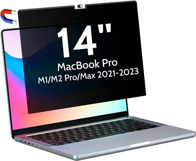 SUPER EASY INSTALLATION: Designed an innovative magnetic mounting method in order to improve the installation of the privacy screen MacBook Pro 14 Inch. The top of the MacBook Pro privacy screen has a reinforced magnetic strip, which can be installed in a second by simply aligning it with the top bezel of the screen and gently pressing it.