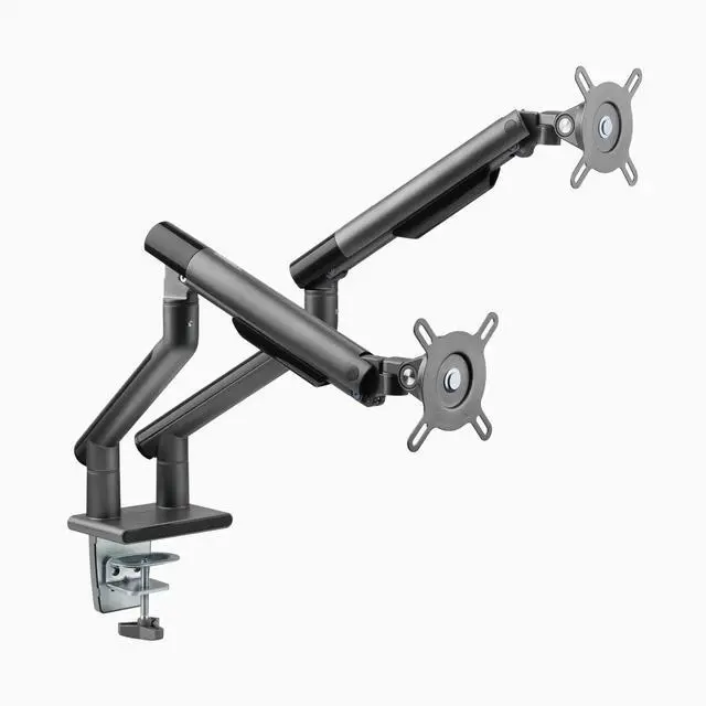 VESA Compatible: The standard for monitor mounts, VESA allows for the easiest of mounts and dismounts - so you can load pretty much any monitors you want onto the arm withs total ease. In-Built Cable ManagementMoving your monitors is much easier if your cables are out of the way - which is why we design our monitor arms to do the job for you. Both of the slimline monitor arms on the dual mount have cable management built in, allowing you to route your worse down the arms themselves. Maximise your desk space, declutter, and prevent accidents by keeping your cables safely tucked away. Discreet SupportThe slimline design of our Dual Slim arm hides their strength - these workhorses are made to do their work out of sight. Capable of carrying two full size monitors with ease, the spring mounts and aluminium construction combine to give you total stability, as well as a full range of potential movements and positions.