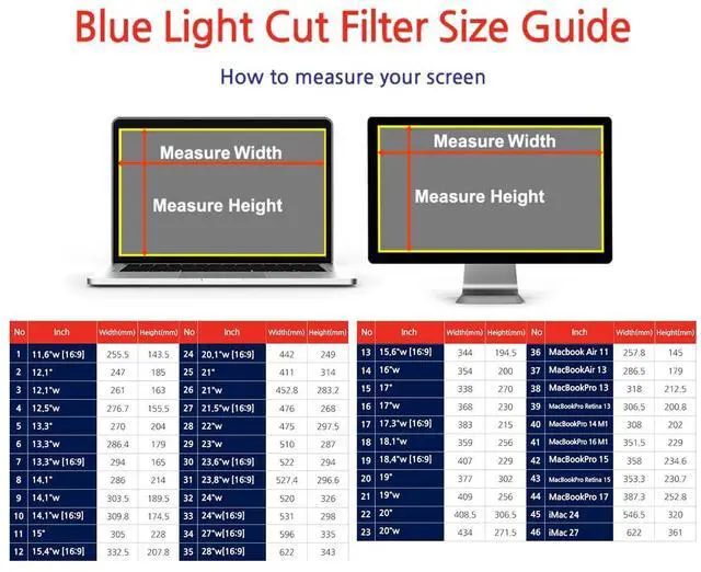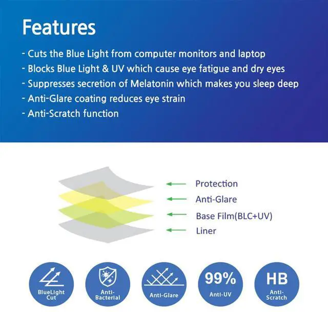 Screen Size : 496 x 310 mm Aspect Ratio 16 : 10 Anti-UV : 99% (200-400nm) Anti-Blue Light : Approx 45.6% (380-500nm) Anti-Glare : prevent glare and eye fatigue Anti Scratch : HB hardness Made in Korea