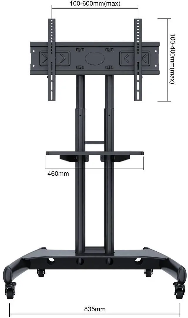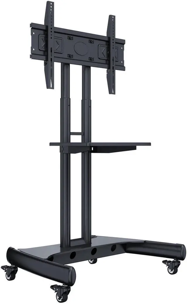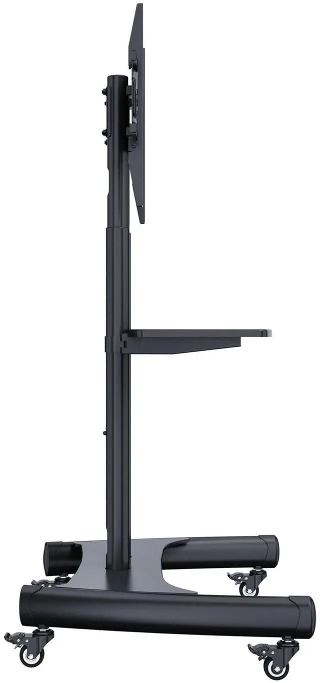 This TV cart has a universal mounting bracket that is compatible with both VESA and non-VESA patterns (from 200x200 up to 600x400), ensuring a secure fit for most screens. Easily adjust your TVs height from 47.6" to 67.3". The AV shelf allows you to to keep laptops and devices up to 10 pounds on the TV cart. Four braked swivel castors make moving and locking the cart easy, and an integrated cable management system keeps wires neat and organized. With a tough, fully welded base and a sleek powder-coated finish, this cart is built for durability and modern aesthetics.
