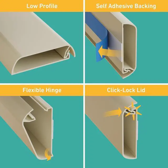 Quick & Easy Installation: lengths have strong self-adhesive backing for easy peel & stick installation, simply clean the wall to remove any dust or residue, remove adhesive liner & stick to the wall - once in place, open hinged lid & snap shut utilizing robust click-lock feature