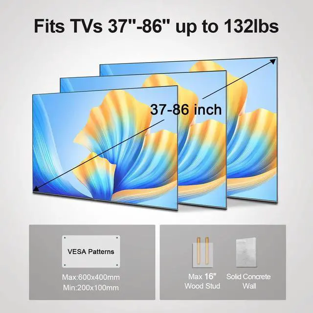 STUDY TV WALL MOUNT BRACKET - Fits for most of 37-86" TVs, support TV up to 132lbs, VESA mount pattern from 200x100mm to 600x400mm, fit wood stud spacing 8", 12", 16", compatible with wood stud, solid brick or concrete wall. Includes detailed instruction, bubble level, standard mounting hardware in pre-labeled bags for easier and quicker installation.