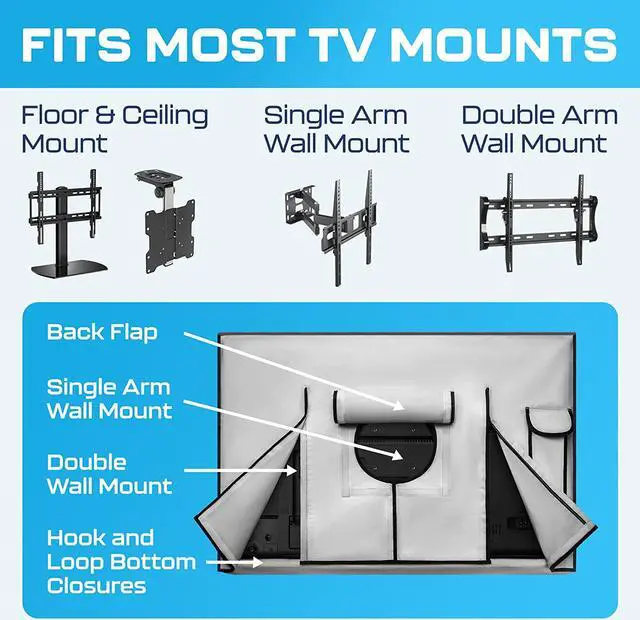 65 INCH TV COVER OUTDOOR WATERPROOF FITS PERFECTLY ON MOST MOUNTS - Your 65 inch tv cover or tv weatherproof case fits perfectly on most tv mounts. Our tv display protectors/ outdoor tv cover looks perfectly neat on your 60-65" outdoor TV protector