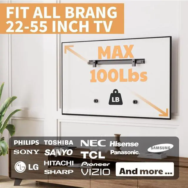 NO-STUD TV WALL MOUNT - Wall studs not required for installation, avoid the hassle of finding studs, AENTGIU studless TV mount accommodates 22 to 55 inch TVs; Can hold up to 100 pounds in dry wall. Low profileextends only 1 inch clearance from the wall for no gap and a clean appearance and can tilt up to +5 degrees