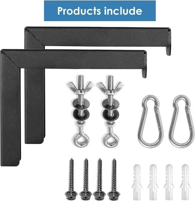 Set includes 6-inch L-bracket * 2, Mountaineering buckle * 2, Ring bolt x 2, Wing Nuts x 2, Nut x 2, Washers x 4, Screws x 4, Self-Tap Drywall Anchors x 4, Instruction book * 1