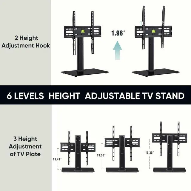 6 POSITIONS 2 WAYS OF HEIGHT ADJUSTMENT - This table top TV stand Mount plate features 3 levels of height adjustment, each height can be adjusted by 2 inch (5 cm) to meet different TV sizes or seating height requirements; TV brackets can also be adjusted at 2 height levels by 1.97 inch (5 cm) for optimal viewing