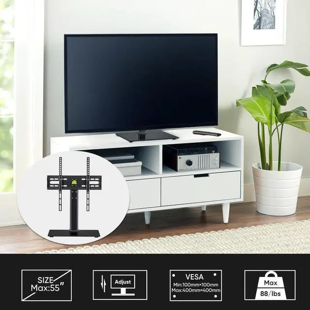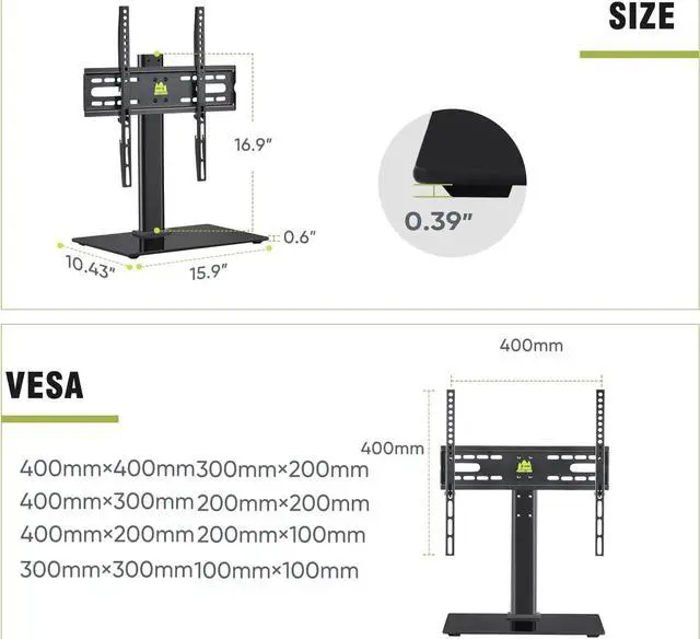 UNIVERSAL DESIGN: This Universal TV Stand base is Universal TV mount bracket design fits most 32" - 55" flat-screen LCD/LED/OLED/ TVs up to 99lbs (45kg), VESA (mounting hole pattern) - compatible faceplate fits VESA 400X400mm 400X300mm 300X300mm 300X200mm 200X200mm 200X100mm 100X100mm.