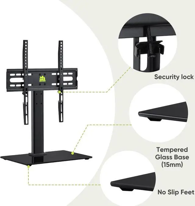 WOODEN BASE TV STAND -This TV mount Stand is designed with wooden base, perfectly solve the fragile problem of the glass base. MDF Eco-friendly material with premium powder coated is anti-fingerprint and easy to clean. Durable steel construction supports TV up to 99 lbs, Make sure to keep your TV sturdy on table and desk, especially safe for kids and pets.
