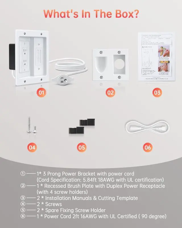 Specification: 5.94 ft 18AWG with UL certification), 1 * Recessed Cable Plate (with 4 screw holders), 1 * Power Cord 2ft 16AWG with UL Certified ( 90 degree), 2 * Installation Manuals, 2 * Screws, 2 * Spare Fixing Screw Holder. For more installation information, please refer to user manual for reference.