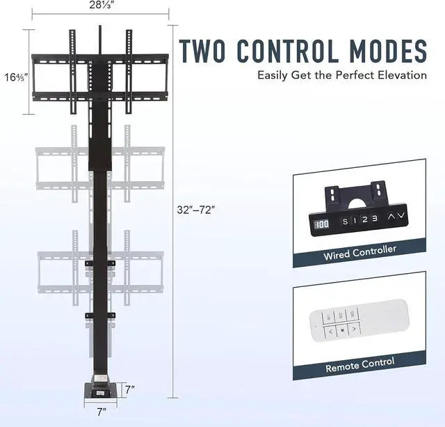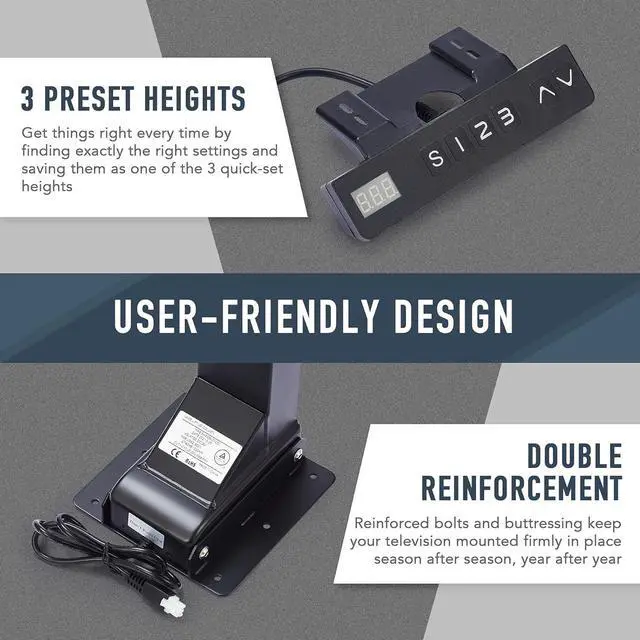 3-LEVEL HEIGHT MEMORY: You can easily program 3 pre-set heights on this TV lift system. It moves smoothly, quietly, and quickly thanks to the revolutionary screw rod structure.