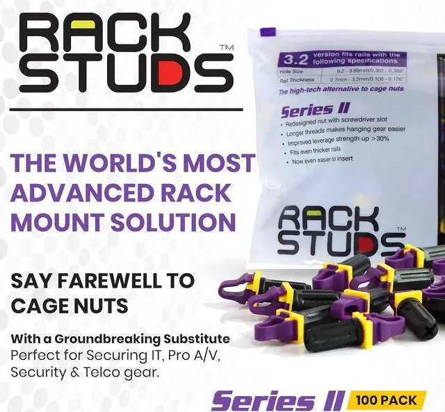 INNOVATIVE RACK MOUNT TECHNOLOGY: Revolutionize your setup with our cutting-edge Rackstuds, the universal replacement for traditional, hard-to-use cage nuts. Ideal for 19 gear, these rack mount accessories are designed to simplify your life and boost efficiency by 30% offering a more user-friendly and streamlined approach to rack mounting.