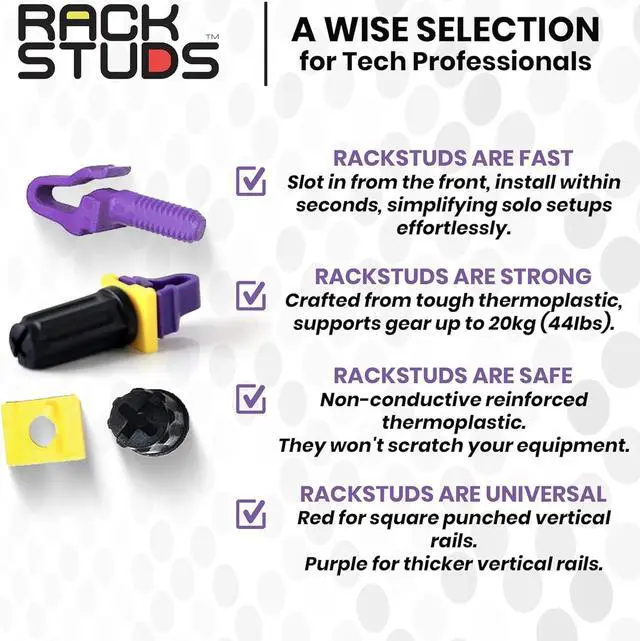 SIMPLE & EASY INSTALLATION: Experience a hassle-free setup with Rackstuds, the go-to cage nut replacement. Great for most rack mount equipment, our system allows you to install from the front with a few easy steps insert, secure, and your server rack accessories are ready to go in under 45 seconds.