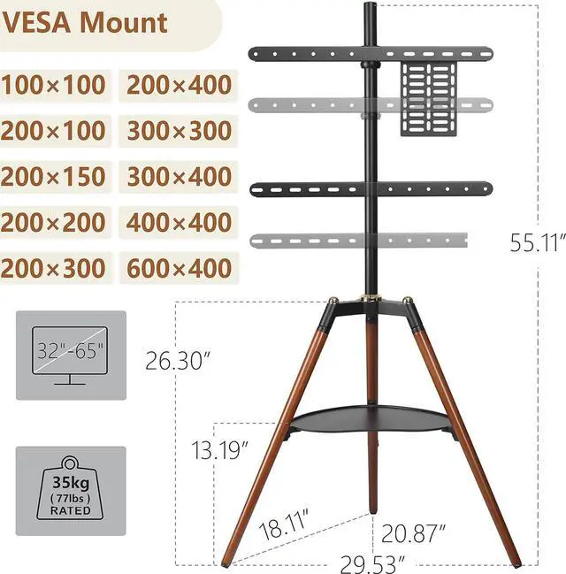 TV StandETHU Tripod Easel TV Stand is a substitute for the typical wall-mounted TV stand in your Living Room, This Stand would be large enough to support a TV and have storage space for a DVD player TV box, wi-fi router, or gaming console underneath it. With this tripod, you give up storage capacity but gain a far more svelte, fashionable object that occupies less room.