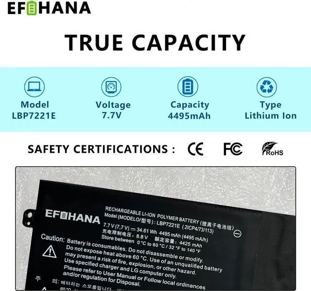 Battery ModelLBP7221EBattery Voltage7.7 VBattery Capacity34.61 Wh / 4495 mAhBattery TypeLi-ionBattery ConditionBrand New From Manufacturer DirectlyPackaging Included1* battery + 1* instruction manual + 1* tool kits Important Note Before Purchasing
