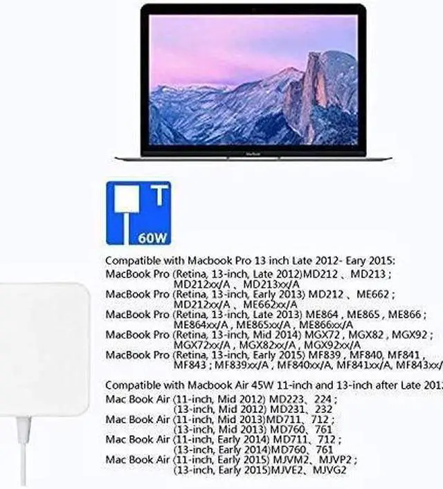 60Watt T-Tip Mac Power Charger Compatible with Macbook Pro 13 inch Late 2012- Eary 2015: