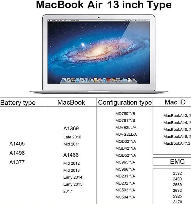 MacBook Air 13 inch Type: Macbook air A1466 battery replacement (2017, Early 2015, Early 2014, Mid 2013), Macbook air A1369 battery (Late 2010, Mid 2011).