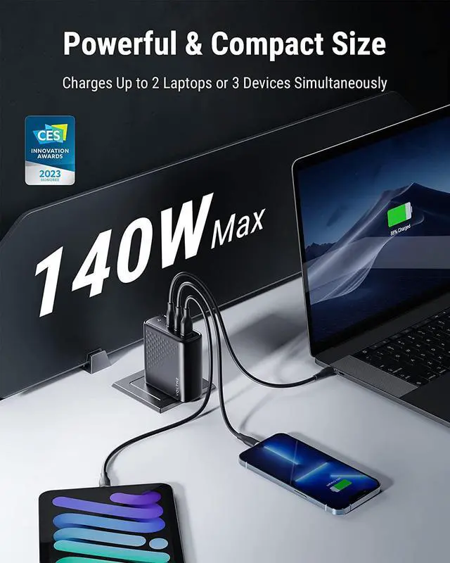 Perfect for Home Office Travel: 20% smaller than an Apple 140W charger, and with even more ports to charge 3 devices simutaneously.