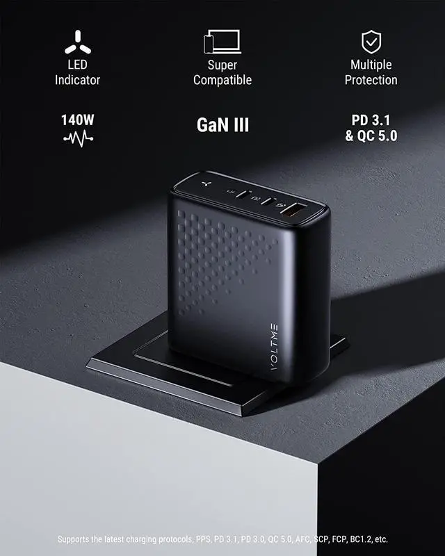 Innovation Award Winner: VOLTME Revo 140 with three ports can suppport almost all fast charging technologies. powered by 3rd Generation GaN Power IC & the latest PD 3.1 & QC 5.0 & PPS charging protocols, provide smaller size and higher power. It can also charge two laptops simultaneously at 65w or one laptop at 140w (28v 5a).