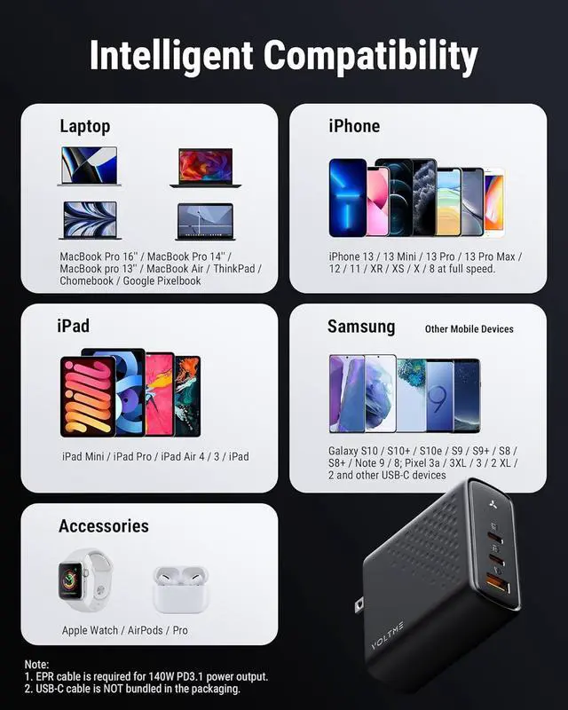 What You Get: VOLTME 140W USB C Power Adapter, welcome guide, 18-month warranty, technical support.