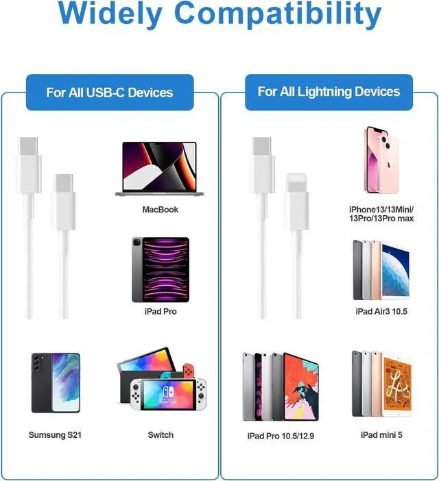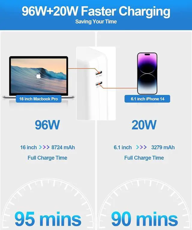 Super Fast Charging Speed116W USB C Macbook charger has a high charging efficiency of up to 96% the charger can fully charge most laptops in about 1 hour and 30 minutes. It can charge most mobile phones from 0% to 80% in 20 minutes. Works with USB C 29W 30W 61W 67W 87W 96W PD model. It can save you a lot of charging time. Widely CompatibilityOur USB C Macbook charger is compatible with MacBook Pro 16 15 14 13 New MacBook Air 13 2022/2021/2020/2019/2018 iPad Pro 12.9 11 2020/2018 and iPad Air 10.9 (2020) and almost all USB - C port devices laptops and smartphones.