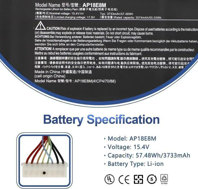Replace Part Number: Replacement for AP18E8M AP18E7M 4ICP4/70/88 4ICP4/69/90 KT. 00407.009. Laptop Battery.
