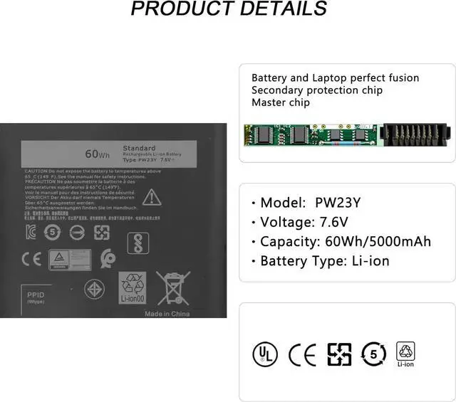 Replace Part Number: PW23Y TP1GT RNP72 0RNP72 0TP1GT 0PW23Y (NOTE: NOT fit for Dell XPS 13 9350 and xps 13 9343)